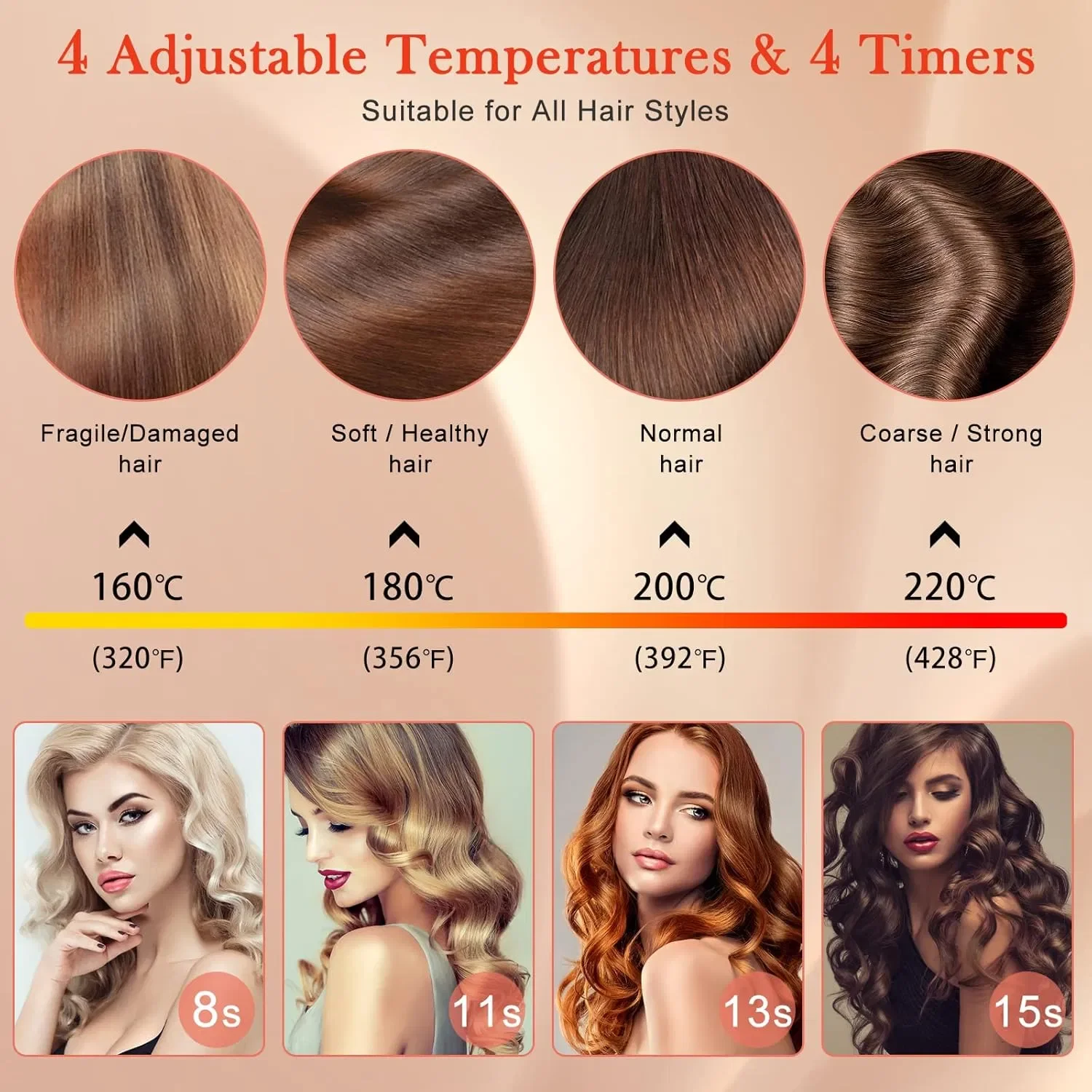 - Constant temperature heating function: Auto Hair Curler, Automatic Curling Iron Wand with 1" Large Rotating Barrel & 4 Temps & 3 Timer Settings, Curling Iron with Dual Voltage, Auto Shut-Off, Fast Heating for Hair Styling. Constant temperature technology ensuring equal heat of each part, better curls and protection for hair.