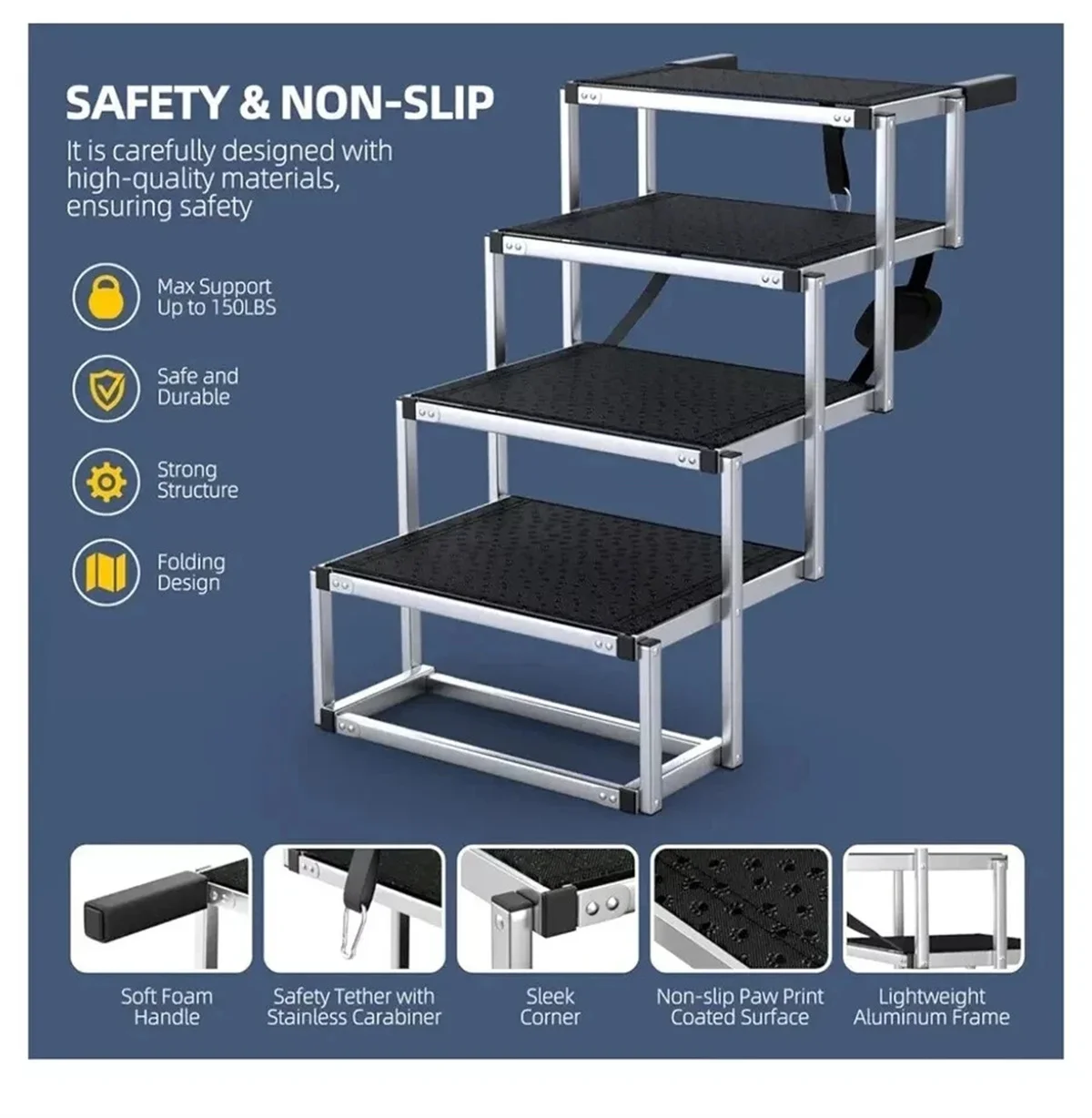 ● Sturdy and Safe: Built with a sturdy aluminum alloy frame, the folding pet steps can support pets up to 150 lbs. They remain stable and do not wobble. Foam handles and safety tether clips enhance safety, preventing pets from slipping while climbing.